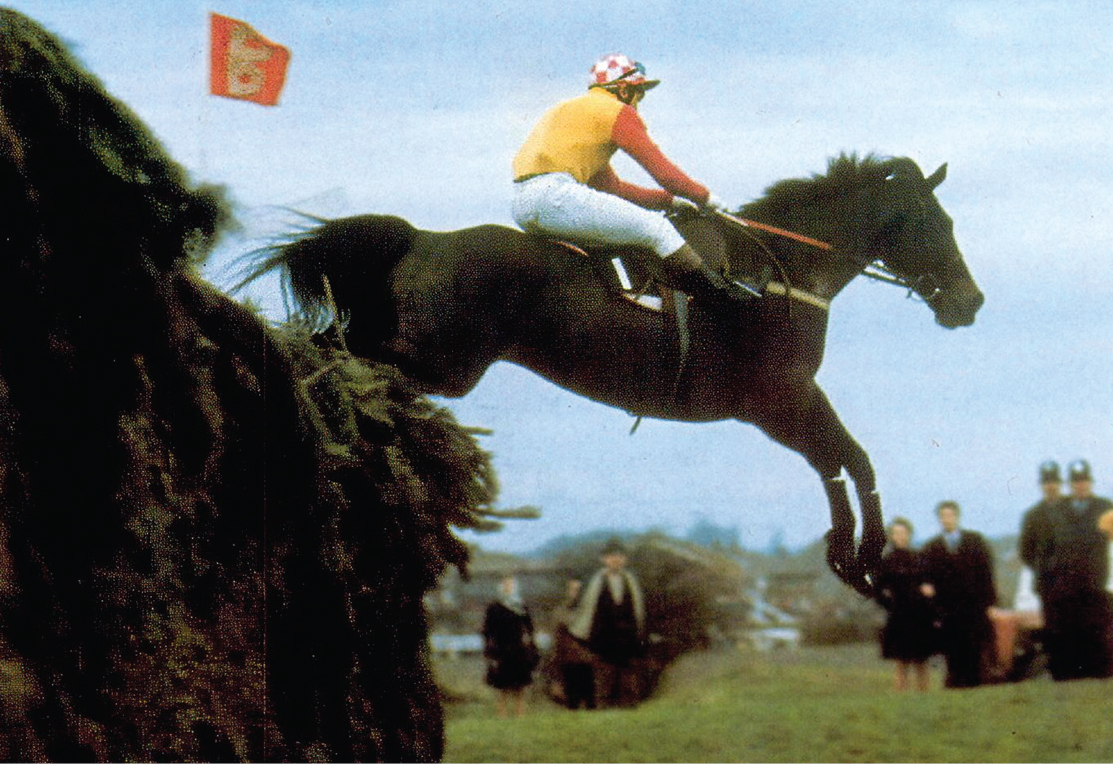 Crisp and Richard Pitman soar over the treacherous Becher’s Brook, lengths ahead of the field, in the 1973 Grand National Steeplechase, Aintree (photo: Gerry Cranham).